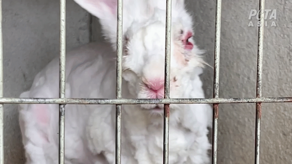 Have you ever heard a rabbit scream? Bunnies hardly ever utter a sound, but in the footage obtained by PETA Asia from several angora wool factory farms in China, where most of the world’s angora wool is sourced, you will hear their blood-curdling screams. You’ll see rabbits frozen from fear. You’ll see workers tightly tying the rabbits’ legs and recklessly shaving or violently plucking their hair out.