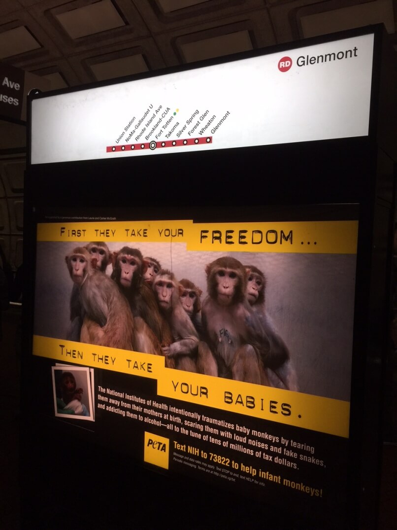 Coming on the heels of our exposé of the cruel psychological experiments being conducted on baby monkeys at a National Institutes of Health (NIH) laboratory, PETA is blitzing the Washington, D.C., Metro system with more than 250 ads on trains and in stations that take NIH leaders to task for tearing newborn monkeys away from their mothers, blasting them with loud noises, and forcing them to become addicted to alcohol. Take a look at what Metro riders—including congressional staffers and legislators boarding at Union Station and the Federal Triangle—will see: